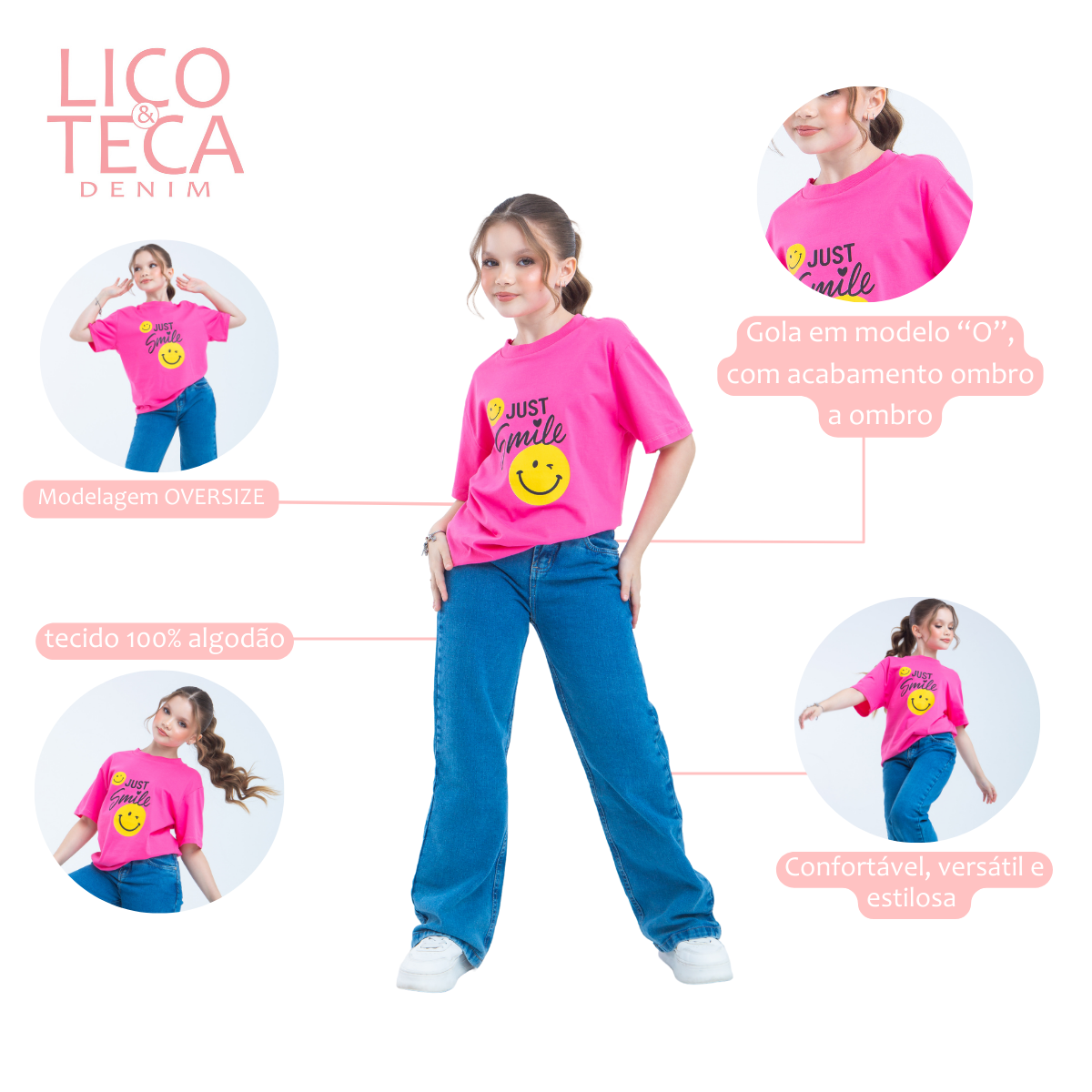 A T-shirt Just Smile é a escolha perfeita para meninas que valorizam estilo, conforto 💖. Confeccionada em malha menegotti 100% algodão, esta camiseta proporciona toque suave e respirabilidade, ideal para o dia a dia 🌿.