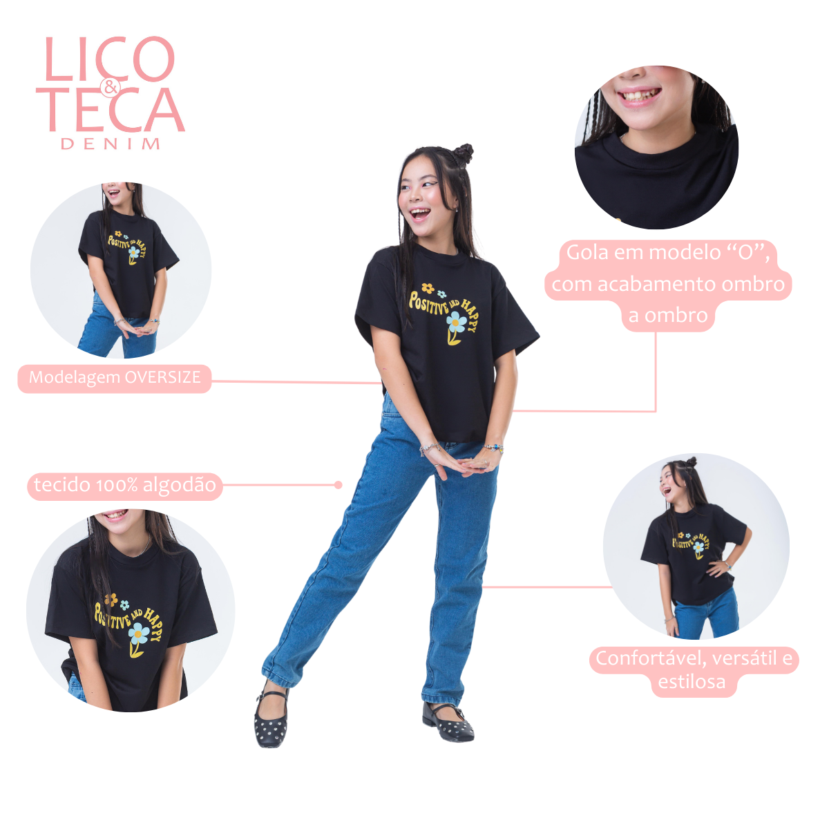 A T-shirt Positive and Happy é a escolha perfeita para meninas que valorizam estilo, conforto 💖. Confeccionada em malha Menegotti 100% algodão, esta camiseta proporciona toque suave e respirabilidade, ideal para o dia a dia 🌿.