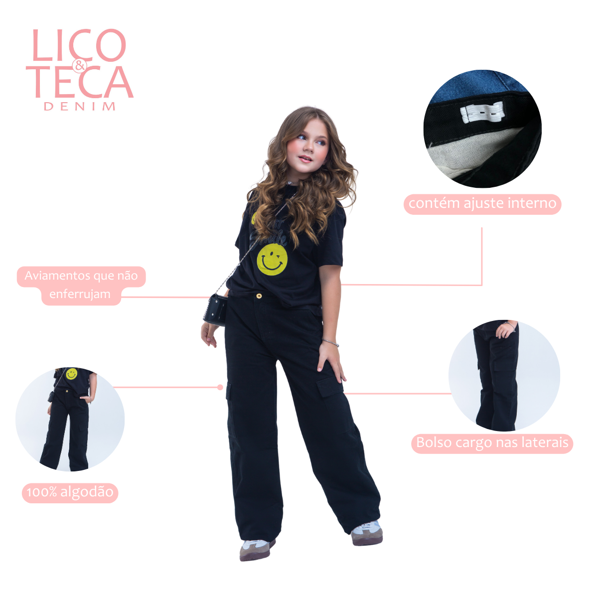 Calça Wide Cargo Alyssa em jeans preto, disponível do tamanho 10 ao 16.